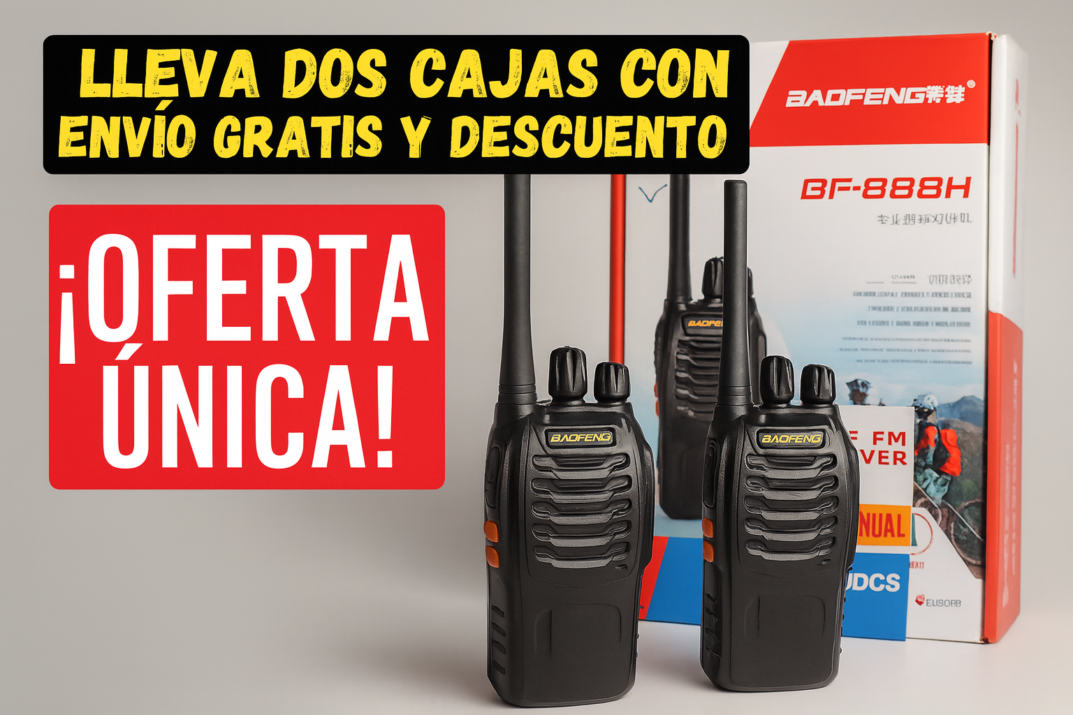 Cada kit incluye 2 radios Baofeng BF‑88H, 1 cargadorUSB tipo C para dos conexiones, 2 clips, 2 baterías recargables de 1500 mAh, y manual de uso.